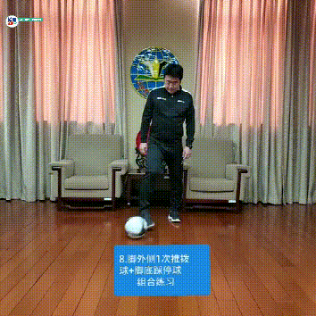 8。 脚外侧1次推拨球+脚底踩停球组合练习