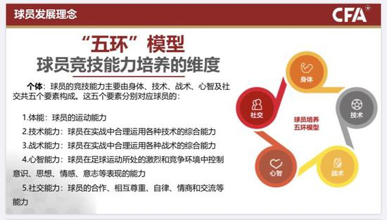 《青训大纲》明确了球员发展理念,要求为球员营造健康积极正能量的成长环境,将技术、战术、身体、心智和社交构成的球员发展五环模型作为球员竞技能力培养和评估的关键环节。比赛理念方面,《青训大纲》要求教练员了解进攻和防守原则以及比赛的四个主要时刻,在比赛中发现问题并在接下来的训练中制定解决方案。此外,《青训大纲》还明确了训练理念,强调训练源自比赛,明确了1v1和无球战术能力是球员发展的基础。