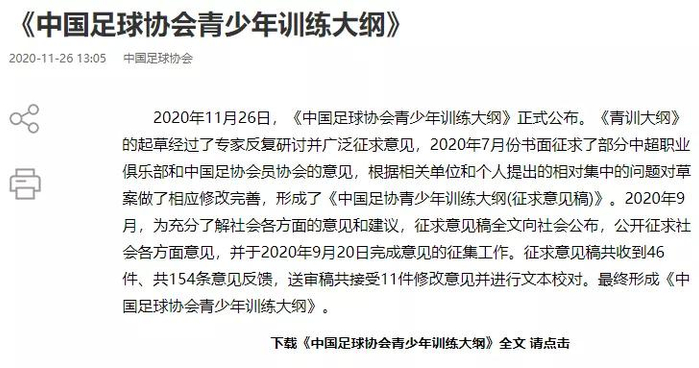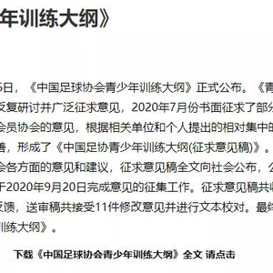 不久之前,《中国足球协会青少年训练大纲》(以下简称《青训大纲》)正式公布。长达121页的文件明确了中国足球的青训发展目标、球员发展理念、比赛理念、训练理念、执教理念以及1v1和无球战术能力是球员发展的基础等。