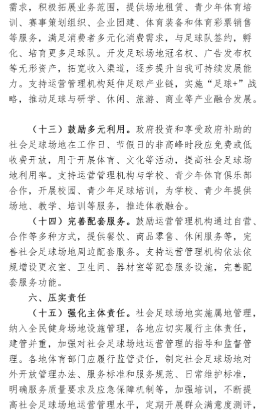 《意见》要求,政府投资的社会足球场地应对学生、基层足协、社区足球俱乐部、青少年体育俱乐部等群体或机构优惠开放。通过政府购买服务方式推动社会力量投资建设的社会足球场地免费或低收费开放。机关、企事业单位等内部社会足球场地应积极创造条件向社会开放。其中,政府投资和享受政府补助的社会足球场地应保证全年向社会开放,每周开放时间一般不少于35小时,全年开放时间一般不少于330天。