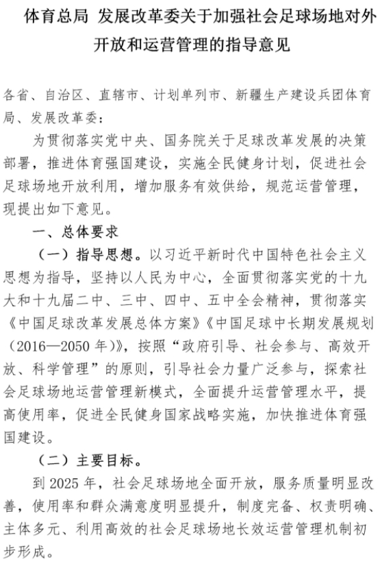 此前在2019年,针对足球场地设施建设的问题,国家发展改革委、国家体育总局共同制定了《全国社会足球场地设施建设专项行动实施方案(试行)》,通过一系列举措来进一步激发社会力量参与足球场地设施建设的积极性。如今,针对足球场地设施开放的问题,国家体育总局、国家发改委又联合印发了《关于加强社会足球场地对外开放和运营管理的指导意见》。