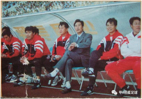 1997年十强赛戚务生的教练班子,迟尚斌为替补席上左二。