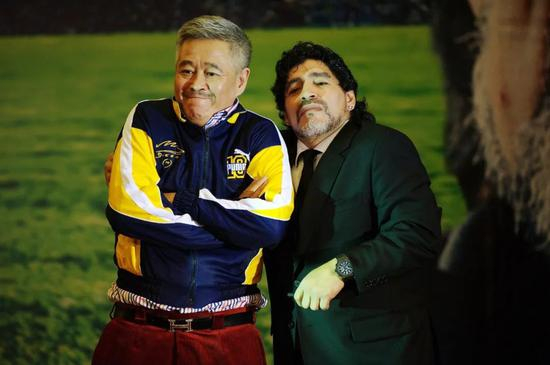 2010年11月4日,马拉多纳温暖中国行慈善晚宴举行,身旁站着爱好足球的赵本山。/ 视觉中国