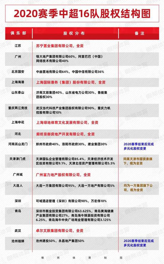 2020赛季中超16队股权结构,根据天眼查及其他信息综合整理。