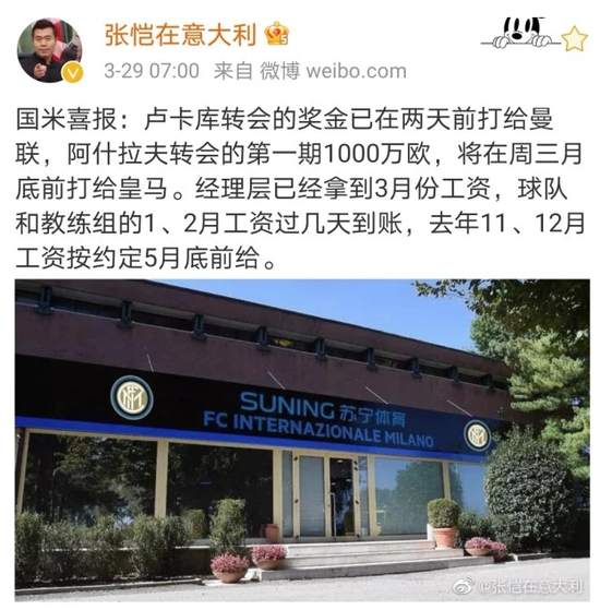 国米全队今年1月份和2月份的工资将马上发放,过几天就会打到球员们的账户上。去年11月和12月的工资还得等等,但最晚也就到5月份就会补齐。