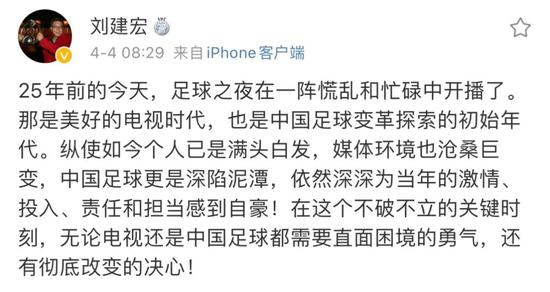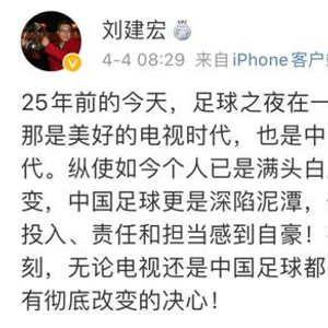 4月4日,清晨的冷雾尚未散去,现任凯利时科技董事长的刘建宏,就用一条充满深意的微博将所有球迷的目光和思绪,再度拉进那个已经不是主流角色、但始终擎驻一席之地的老牌节目:《足球之夜》。