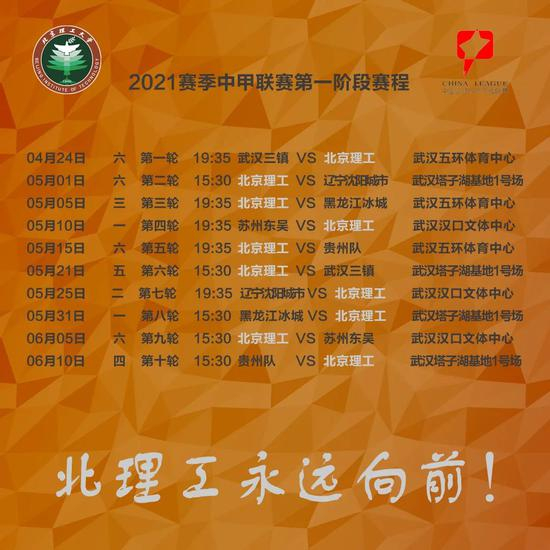 今年中甲联赛共有18支球队,将在武汉、大连、梅州三个赛区采取分阶段赛会制形式,完成双循环全部34轮比赛。经过抽签,北理工第一阶段的十场比赛将在武汉赛区进行,同赛区球队包括武汉三镇、贵州队、苏州东吴、辽宁沈阳城市、黑龙江冰城。根据赛程安排,北理工从第二轮比赛开始,将先后与沈阳城市、黑龙江、苏州东吴和贵州队进行交锋。