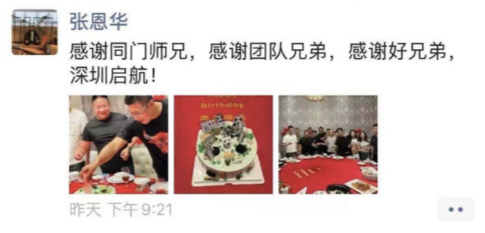 昨天,朋友们为张恩华准备了一场生日宴,他也在配文中对朋友们表示了感谢。张恩华写道:感谢同门师兄,感谢团队兄弟,感谢好兄弟,深圳启航!
