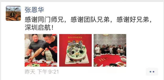 就在28日晚,张恩华还在朋友圈晒图分享了与朋友们的聚餐。他写道:“感谢同门师兄,感谢团队兄弟,感谢好兄弟,深圳启航!”谁也没有想到,这是他发朋友圈的最后一条内容。
