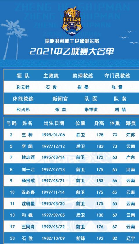 5月12日下午,中乙昆明郑和船工公布2021中乙赛季的俱乐部大名单,全队33人,平均年龄21.7岁。