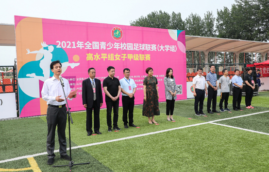 开幕式上,全体与会人员面向国旗奏唱国歌,齐唱《没有共产党就没有新中国》。嘹亮的歌声表达了大学生奋进新时代、永远跟党走的坚定理想信念,这是当代大学生庆祝中国共产党建党100周年的青春献礼! 2021年全国青少年校园足球联赛(大学组)高水平组女子甲级联赛由全国青少年校园足球工作领导小组办公室主办,山东省教育厅、山东鲁能泰山足球学校承办,中国大学生体育协会协办,共有来自浙江大学、同济大学、中国矿业大学、北京中医药大学、武汉体育学院、曲阜师范大学、哈尔滨体育学院等全国24所高等院校近600名运动员参赛。 教育部体育卫生与艺术教育司一级巡视员郝风林在开幕式讲话中指出,开展足球运动有利于提高青少年体质健康水平,有利于培养爱国主义、集体主义精神和顽强拼搏的意志品质,有利于提高中国足球的竞技水平。多年来,教育部坚持“教学是基础,竞赛是关键,体制机制是保障,育人是根本”理念,凝炼出“踢出快乐,拼出精彩”的校园足球精神,全力推进校园足球改革发展。经过不懈努力,校园足球工作实现了“一年一大步,步步有光彩”。