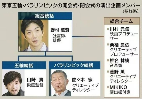 起初,奥运会开闭幕式总导演是山崎贵,但是由于他个人的电影拍摄进度问题,无法全身心参与到开幕式的设计,因此他主动退出团队。于是,开闭幕式总导演就成了总负责人野村万斋。