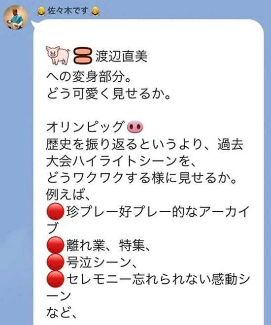 没想到《周刊文春》又爆猛料,在今年3月25日的刊物中曝光了佐佐木宏曾在LINE聊天中建议让著名搞笑女艺人渡边直美在奥运开幕式上扮猪,以对应‘Olympig’的谐音烂梗。