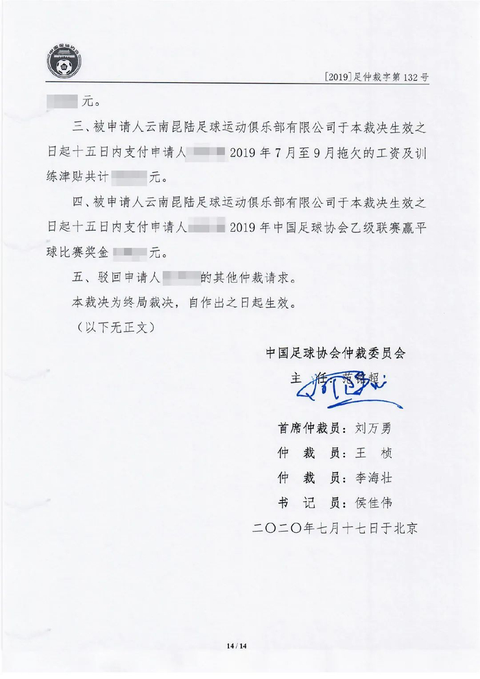 尤其是涉及到经济赔偿方面,每一分钱,对于吃青春饭的球员,尤其是一些不能在网上公开发声讨薪的不知名球员来说,对退役后没有任何特殊谋生技能的他们来说,都特别重要。对于一些动辄就以赔钱就退出的俱乐部而言,仲裁委没有轻易“屈服”,裁决书一经发出,如果一方当事人坚决不执行裁决,个人或者单位都会受到相关的纪律处罚。球员可能会被禁赛,而俱乐部则无法获得下赛季的准入资格。