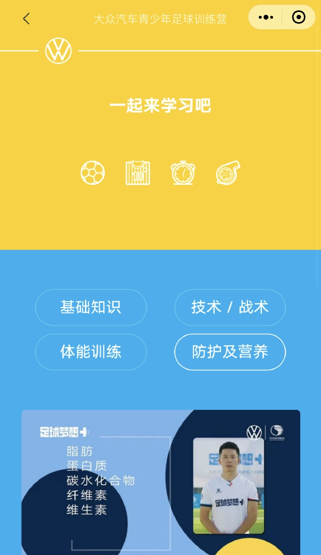 基础知识、技术/战术、体能训练和防护及营养,是大众汽车青少年足球训练营微信小程序为“青少年足球课程”推出的四大课程类别,简洁明了的页面设计和极易上手的交互体验,足以让小球员和父母快速地获取到感兴趣的信息。而在“教练员课程”的分类中,课程导论、训练教程、执教理念和比赛指导的板块同样各就各位,可以随时为利用碎片时间钻研业务的青训教练提供帮助。