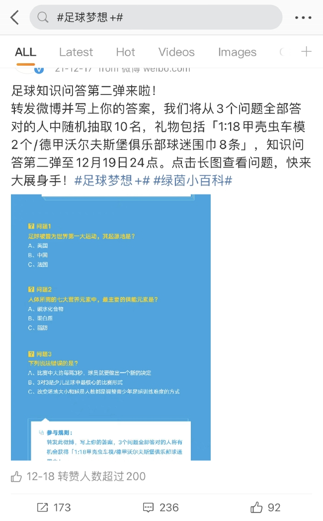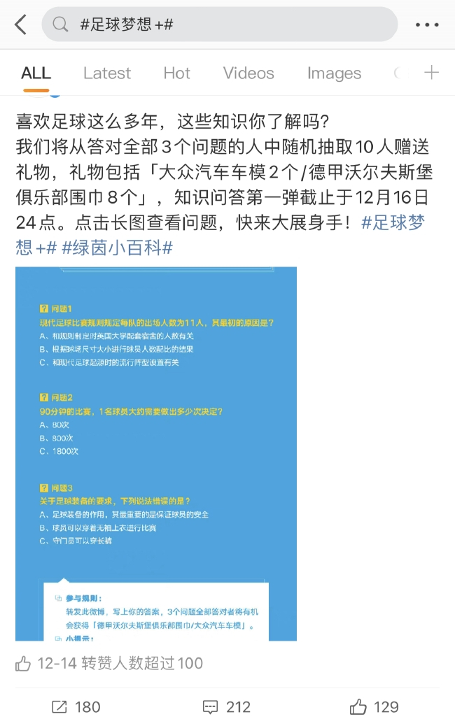回溯近一个月,伴随着小程序的注册人数越来越多,与大众汽车青少年足球训练营项目相关的“足球梦想+”话题,也在微博上逐渐聚集着点击量——阅读数亦能单日破万。与此同时,包罗万象的知识问答——“绿茵小百科”,以及一呼百应的挑战项目——“带球小旋风”,吸引了大批球迷和从业者的参与。无论男女老少、无论专业业余,都在自己拍摄的视频中一展身手,向沃尔夫斯堡的小球员发起挑战。