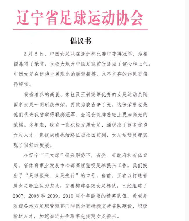 2月8日,辽宁省足协发布倡议书,鼓励各地发展女足项目并组建队伍,将女足打造成为辽宁的体育名片。