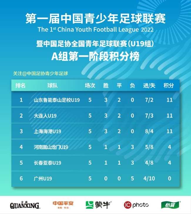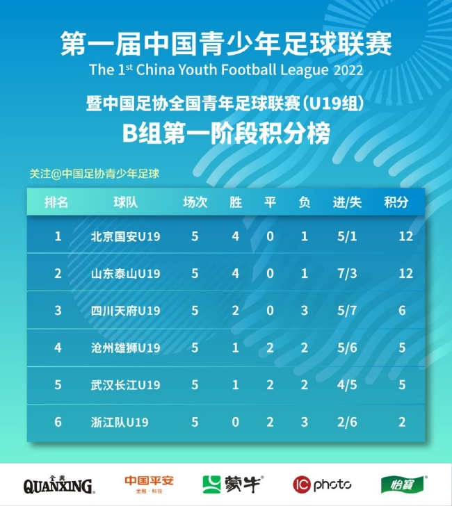 北京时间8月7日,第一届中国青少年足球联赛(U19组)A、B组第一阶段的比赛在昆明海埂体育训练基地战罢,最终A组山东鲁能泰山U19队获得这一阶段的小组第一,B组北京国安U19夺得小组第一。8月10日-19日,C组、D组、E组的预选阶段比赛将会进行,最终根据小组排名26支队伍将会进行正式的排位角逐,决定升降级阶段的分组。