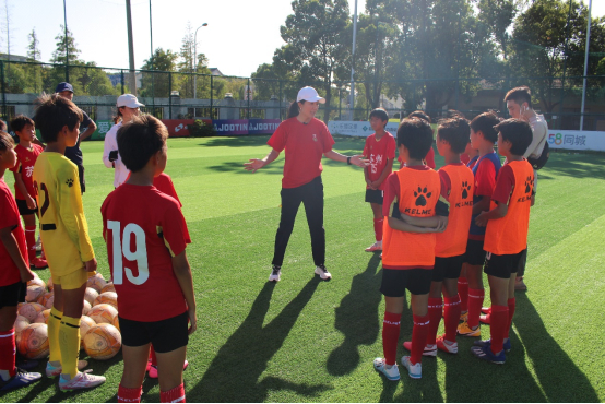 在随后的训练课上,浦玮和球队教练一起亲自指导孩子们的技术动作,当发现有的小球员动作不对的时候,浦玮非常耐心地进行讲解与示范,而且是绝不漏过每一个孩子,所有人的动作都要完成标准才能进入下一个环节。