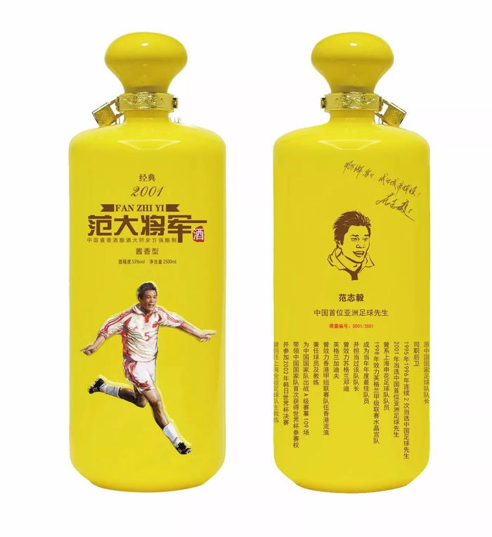 ”范大将军限量签名酒”由中国酱香酒酿酒大师余方强酿制,既是对中国足球王者范志毅的高度认同,也是对中国酒文化与足球文化联姻的崇高礼赞!