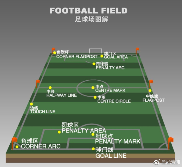 H:角球弧 corner arc,罚球点 penalty mark,中点 centre mark,中圈 centre circle,罚球弧 penalty arc,角旗 corner flagpost。我发你个图片,上边都有标明了,记好了,下次考你。
