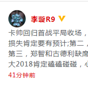 《足球》报国内部主任李璇:卡帅回归首战平局收场,没必要妄自菲薄,第一,你既然决定不重金引援,战力损失肯定要有预计;第二,裁判开场的几个判罚大家心里有数,确实影响了比赛;第三,郑智和古德利缺席也确实让进攻限于两个边路传中的尴尬状态,这样的恒大2018肯定磕磕碰碰,心态平和会觉得容易理解一些。