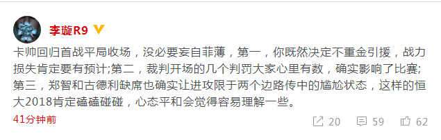 北京时间2月14日,在亚冠首轮的一场争夺中,广州恒大主场被武里南联1比1逼平。赛后,足球圈众大V也对比赛发表了自己的看法。