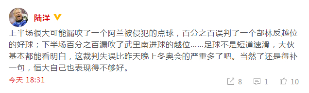 陆洋:上半场很大可能漏吹了一个阿兰被侵犯的点球,百分之百误判了一个郜林反越位的好球;下半场百分之百漏吹了武里南进球的越位……足球不是短道速滑,大伙基本都能看明白,这裁判失误比昨天晚上冬奥会的严重多了吧。当然了还是得补一句,恒大自己也表现得不够好。
