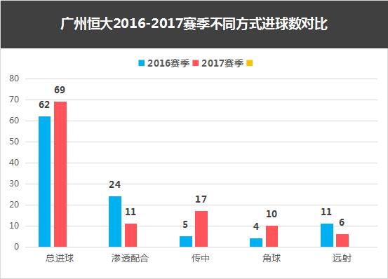 到了2017赛季,恒大虽然打入69球,比前一年还多,但是渗透配合进球骤降到11个,运动战传中和定位球进球(包括角球、点球)成为了最主要的进球手段。