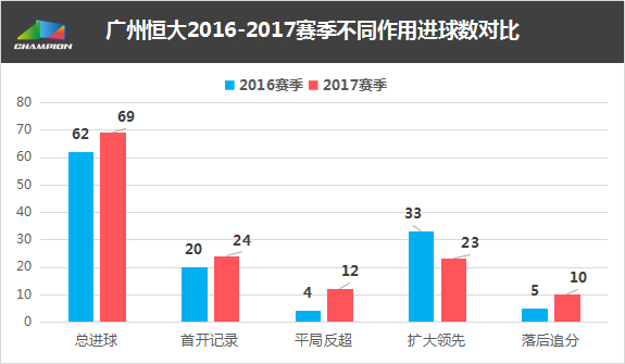 但是到了2017赛季,恒大虽然打入69球,并且有24场比赛率先取得进球,但是扩大领先的进球下降到23球,两者之和占比下降到68.1%,平局和落后时的进球大大增加。