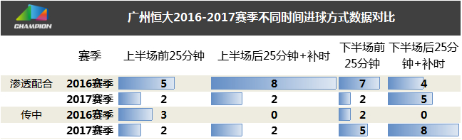 而在2017赛季,恒大的进球主要在下半场,尤其比赛最后20分钟,渗透配合和边路传中的进球数才猛增,说明在前面的比赛中,恒大的进球能力出现了严重的下降。