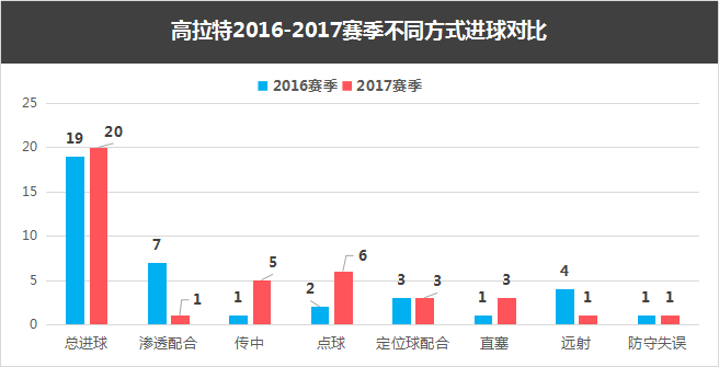 2016赛季,高拉特打入19球,其中渗透配合7球,远射4球,他的主要进球方式就是恒大全队的主要方式;到了2017赛季,高拉特打入20球,传中5球、点球6球、定位球配合3球,渗透配合、远射进球都下滑很明显,跟恒大全队的表现一致。