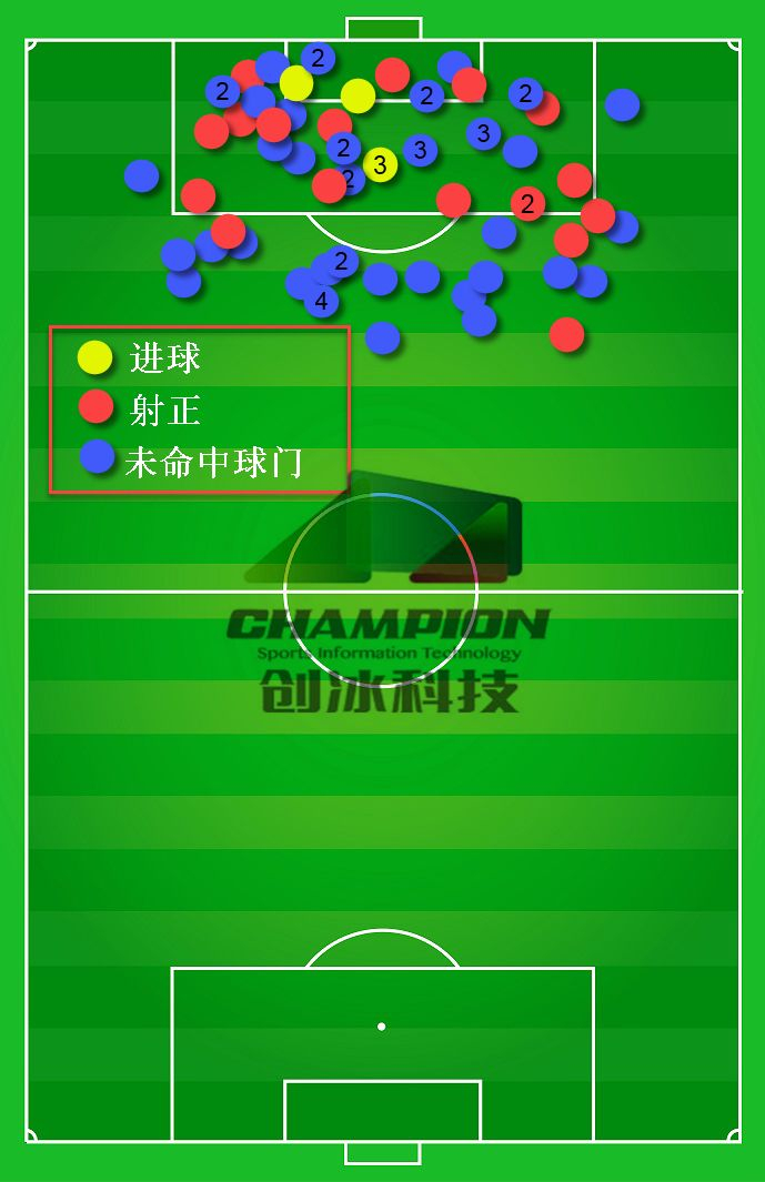 从不同状态下的射门位置图能更清楚地反应问题。在高拉特有运动战进球的11场比赛里,他的55次射门有29次分布在禁区中路,绝大部分进球也集中在这个区域,这是高拉特最重要的进球区域,他能在禁区中路完成射门并且进球,说明恒大整体进攻流畅、压迫性强。
