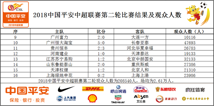 中超联赛APP讯 3月9日-11日,2018中国平安中超联赛展开了第2轮的较量。本轮联赛,中超八个赛区共208540人观赛,场均上座约2.61万人。