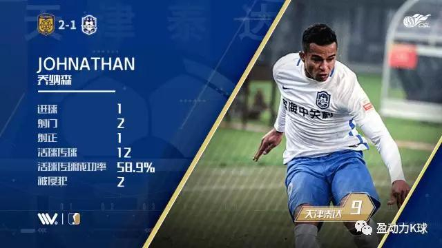 本场比赛为天津泰达攻入唯一进球的是9号乔纳森,这也是昔日K联赛金靴登录中超的首粒进球。乔纳森全场比赛仅完成2次射门,未能给与对手防线更多威胁。在上一轮天津德比中,乔纳森并未获得登场机会,代替其登场的阿奇姆彭完成帽子戏法帮助球队获胜。本场比赛乔纳森与阿奇姆彭搭档锋线双前锋,球队本意是希望二人能够在进攻端给与对手更大的威胁以减轻防守压力,但遗憾未能奏效。乔纳森曾经在K联赛的赛场上证明了自己的个人价值,但能否快速融入球队,适应中超联赛的环境,成为了乔纳森需要首要解决的问题。