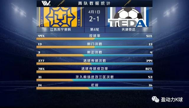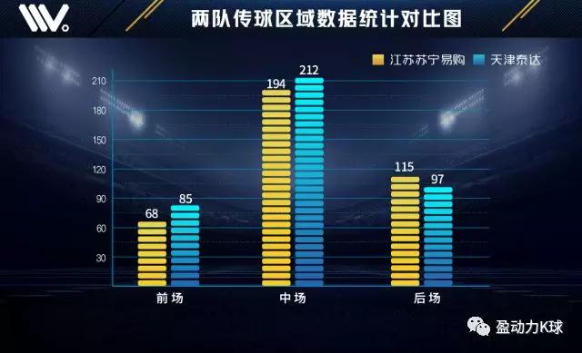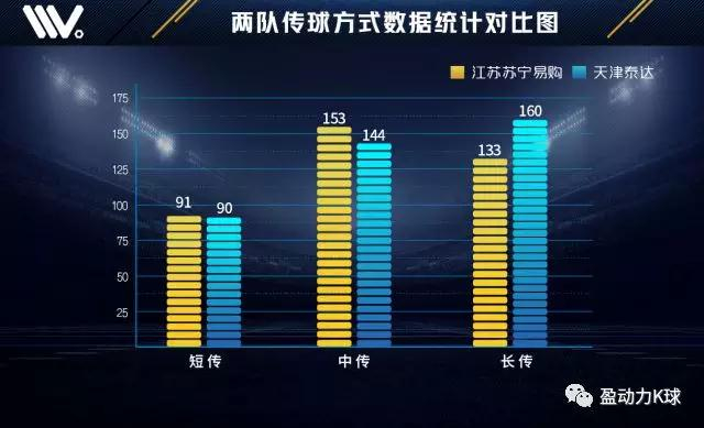 从本场比赛两队数据统计对比中能够看出,客队天津泰达在控球率、传球次数、射正次数以及攻入前场进攻三区次数等方面均高于主队江苏苏宁易购,但除在攻入前场进攻三区次数上,天津泰达领先优势并不明显,射门次数方面两队持平,能够看出本场比赛两队表现势均力敌,但在进攻方面,天津泰达能够更多的攻入前场位置,但无法形成更多的射门以及威胁进攻的机会。