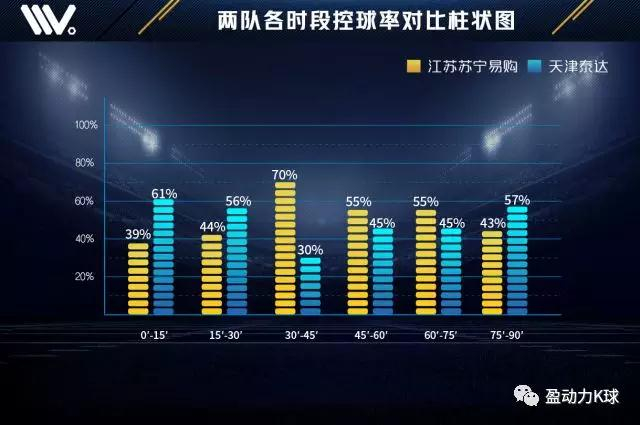 本场比赛两队全场控球率比为49%比51%,天津泰达领先2%。从各时段控球率对比图能够看出,天津泰达在上半场大部分时间及下半场比赛尾声阶段控球率方面占优,而江苏苏宁易购则在上半场尾声阶段领先优势明显,并在下半场开始至领先后占据优势。结合比赛来看,上半场开始阶段,天津泰达攻势明显,占据控球优势,但随后江苏苏宁易购加强中场控制和防守强度,逐渐掌握控球权。下半场比赛取得两球领先后,江苏苏宁易购选择回收防线,控球权再度交还天津泰达。