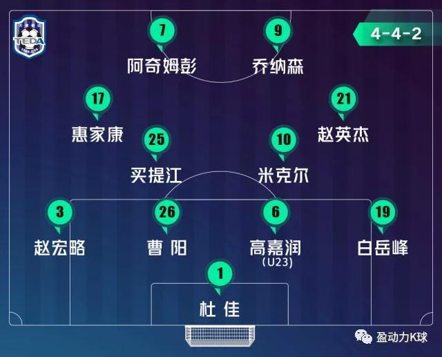 本场比赛天津泰达派上阿奇姆彭和乔纳森的锋线双前锋组合,惠家康和赵英杰分居两侧,米克尔和买提江搭档双后腰。在上一轮天津德比中,阿奇姆彭的惊艳发挥成为了球队获胜的关键,本场比赛球队放弃了外援中卫,以降低防守强度的代价上排出双外援前锋进攻组合,通过加强进攻力争收获客场取胜利,但从本场比赛来看,阿奇姆彭和乔纳森二人并没有形成默契配合,球队进攻端始终无法发挥全部威力,阿奇姆彭依然能够保持很强的冲击能力,造成苏宁3名后卫球员吃到黄牌,但冲击力始终未能转换成威胁进攻。在下半场球队后防线暴露出体能下降的问题,导致球队在2分钟连失两球,最终客场遗憾败北。