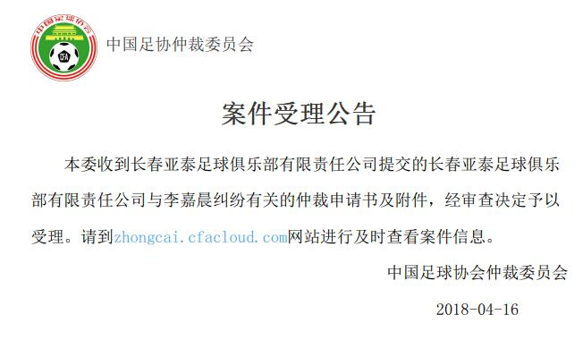 足协仲裁委员《案件受理公告》中称:“本委收到长春亚泰足球俱乐部有限责任公司提交的长春亚泰足球俱乐部有限责任公司与李嘉晨纠纷有关的仲裁申请书及附件,经审查决定予以受理。”