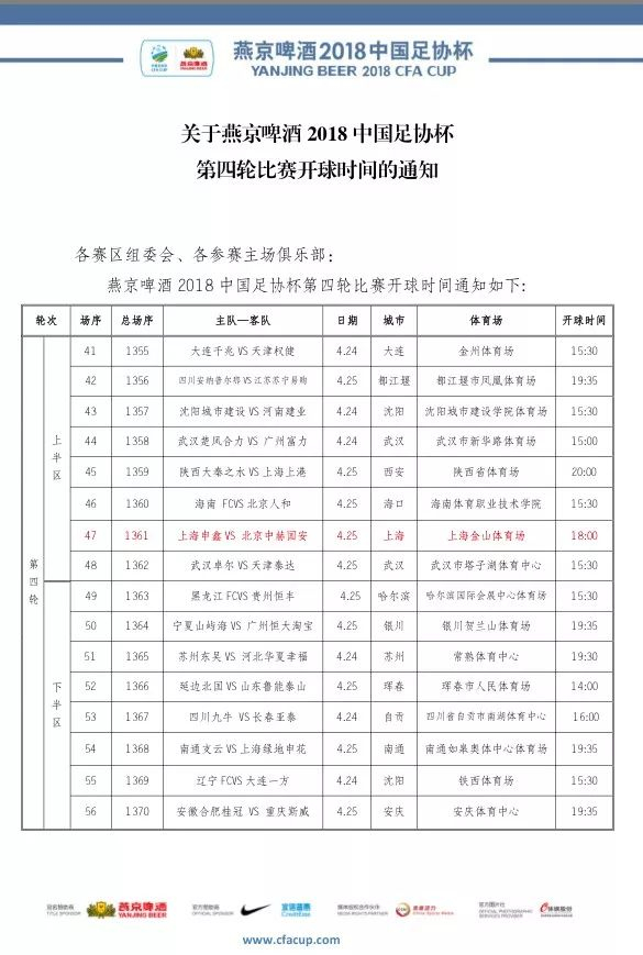 2018中国足协杯第四轮比赛开球时间确定,北京中赫国安将于4月25日星期三18:00做客上海金山体育场迎战上海申鑫,敬请关注。