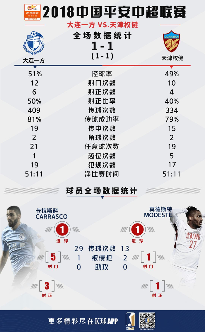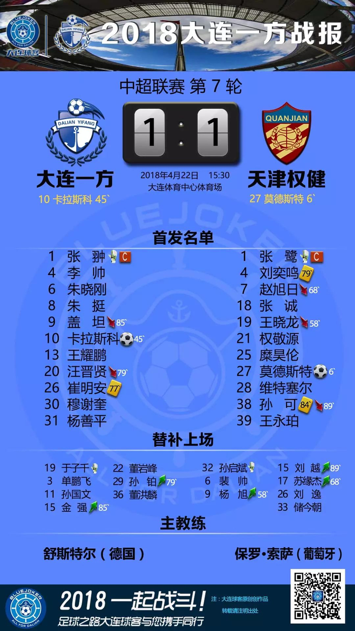 4月22日15:30,2018中超联赛第7轮大连一方主场迎战天津权健。开场5分钟孙可在禁区内被朱挺铲倒,裁判判罚点球,大连一方主场0-1落后;上半场第45分钟大连一方得到点球机会,卡拉斯科轻松将球罚进死角,比分1-1扳平;第86分钟卡拉斯科送出外脚背直塞,穆谢奎过掉张鹭后推空门得分!不过裁判回看VAR之后认定越位在先,进球无效。最终以大连一方1-1憾平天津权健结束本场比赛。