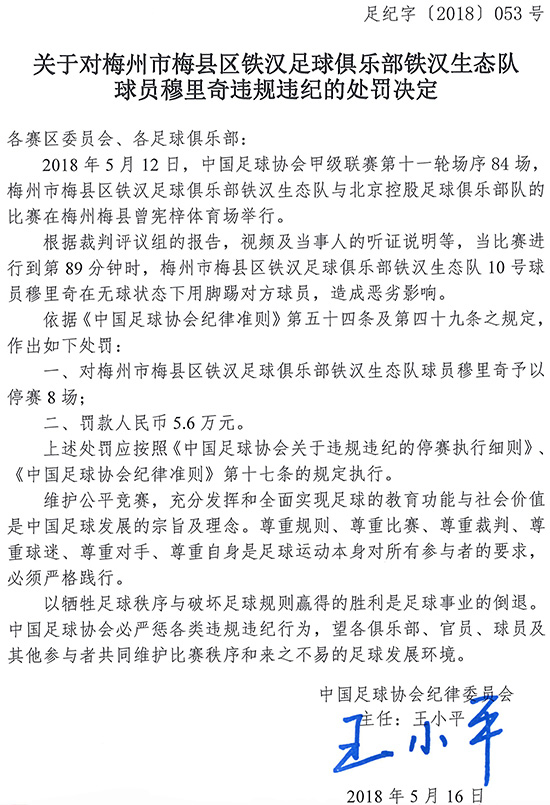 足协:穆里奇无球状态故意踢人禁赛8场 国内足球综合 2018.05.1615:41 关注 虎扑5月16日讯 足协公布罚单,梅县铁汉生态球员穆里奇由于在无球状态下故意踢人,被禁赛8场,罚款5.6万元。相关阅读:GIF:召唤王小平?穆里奇无球状态故意踢人染黄 (编辑:给大家拜个早年) 本文来自:虎扑