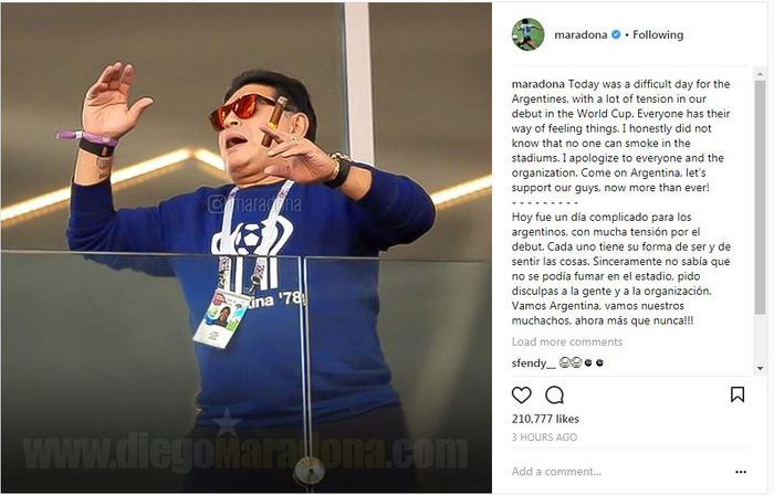 在阿根廷首轮对阵冰岛的比赛中,马拉多纳同样在现场为祖国加油助威。相比于阿根廷沉闷乏味的比赛,球王在球场内吸食雪茄的照片更是令人印象深刻。看台上的老马点燃雪茄,公然违反了球场的禁烟令。赛后,马拉多纳也通过个人社交平台向公众道歉,称自己以前真的不知道在场馆里不能吸烟,向每个人和组织道歉。