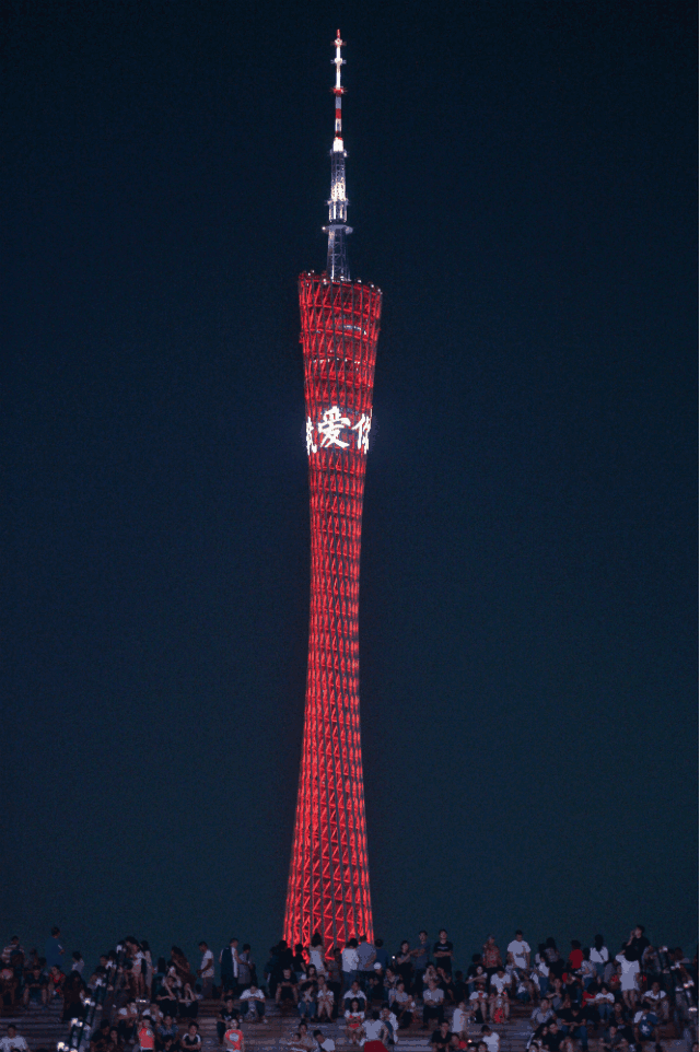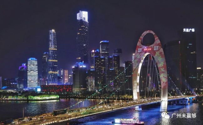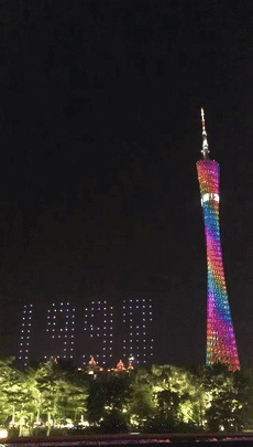 在著名广州塔上就亮起“我爱你中国”的字样。随后在不远处的猎德桥也开始亮灯,打出改革开放40年以及幸福广州等口号。