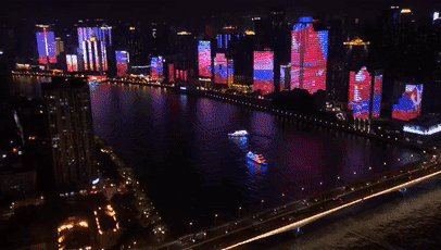 精彩的灯光秀又岂止在珠江新城一带,昨晚珠江两岸从西往东,就像一幅流动的画卷,沿江路上的24栋建筑外墙都挂上了五彩缤纷的LED灯光,图案从五星红旗到五羊雕像等多种变换,美不胜收。