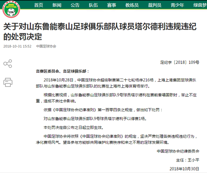 足协:塔尔德利赛前奏唱国歌时举止不庄重停赛1场 国内足球综合 2018.10.3115:59 关注 10月31日,中国足协下发了《关于对山东鲁能泰山足球俱乐部队球员塔尔德利违规违纪的处罚决定》,由于上轮塔尔德利在赛前奏唱国歌时,举止不庄重,造成不良社会影响,停赛1场。 本文来自:第12人