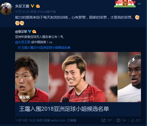 虎扑11月20日讯 昨日,亚足联官方宣布,中国球员王霜入围2018亚洲足球小姐候选名单。而王霜本人转发了亚足联官方微博发表的相关信息,并且谈到了自己的感受。