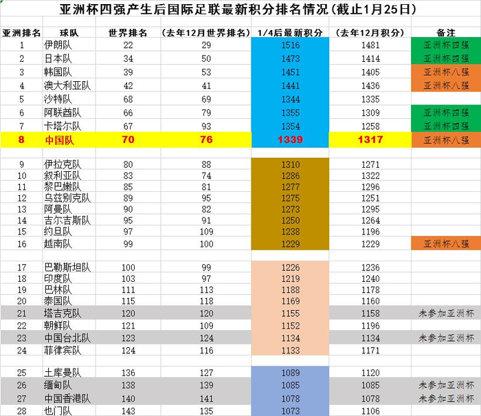还是来看一下1月25日本届亚洲杯赛1/4决赛之后目前亚洲各队的最新的国际足联排名与积分情况吧。请看下表(注:总分采用四舍五入的计算方式):