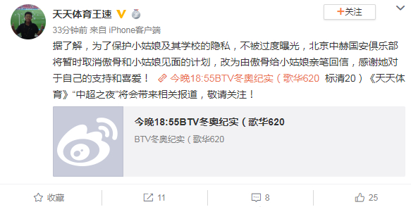 据了解,为了保护小姑娘及其学校的隐私,不被过度曝光,北京中赫国安俱乐部将暂时取消傲骨和小姑娘见面的计划,改为由傲骨给小姑娘亲笔回信,感谢她对于自己的支持和喜爱!