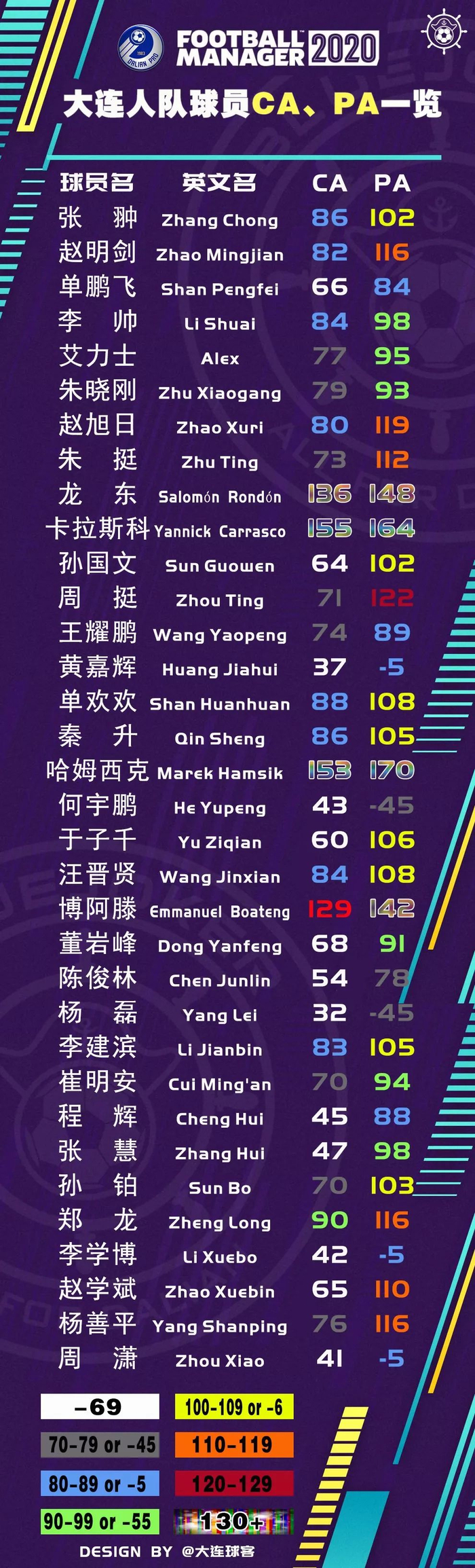 由著名游戏公司SEGA推出的足球游戏FM2020(Football Manger2020),已经上市近三月时间,欧洲冬窗关闭后,SEGA第一时间也对版本进行更新。新版的游戏数据做的非常详细,中超球队从一线队到U19梯队球员的数据一应俱全。每当FM的新作发售,除开潜力新星的数值高低,相信周围玩家们也非常关心在新作中,中国球员和大连球员的CA(实力)、PA(潜力)。今天小编通过大连球客平台与大家分享一下游戏心得。